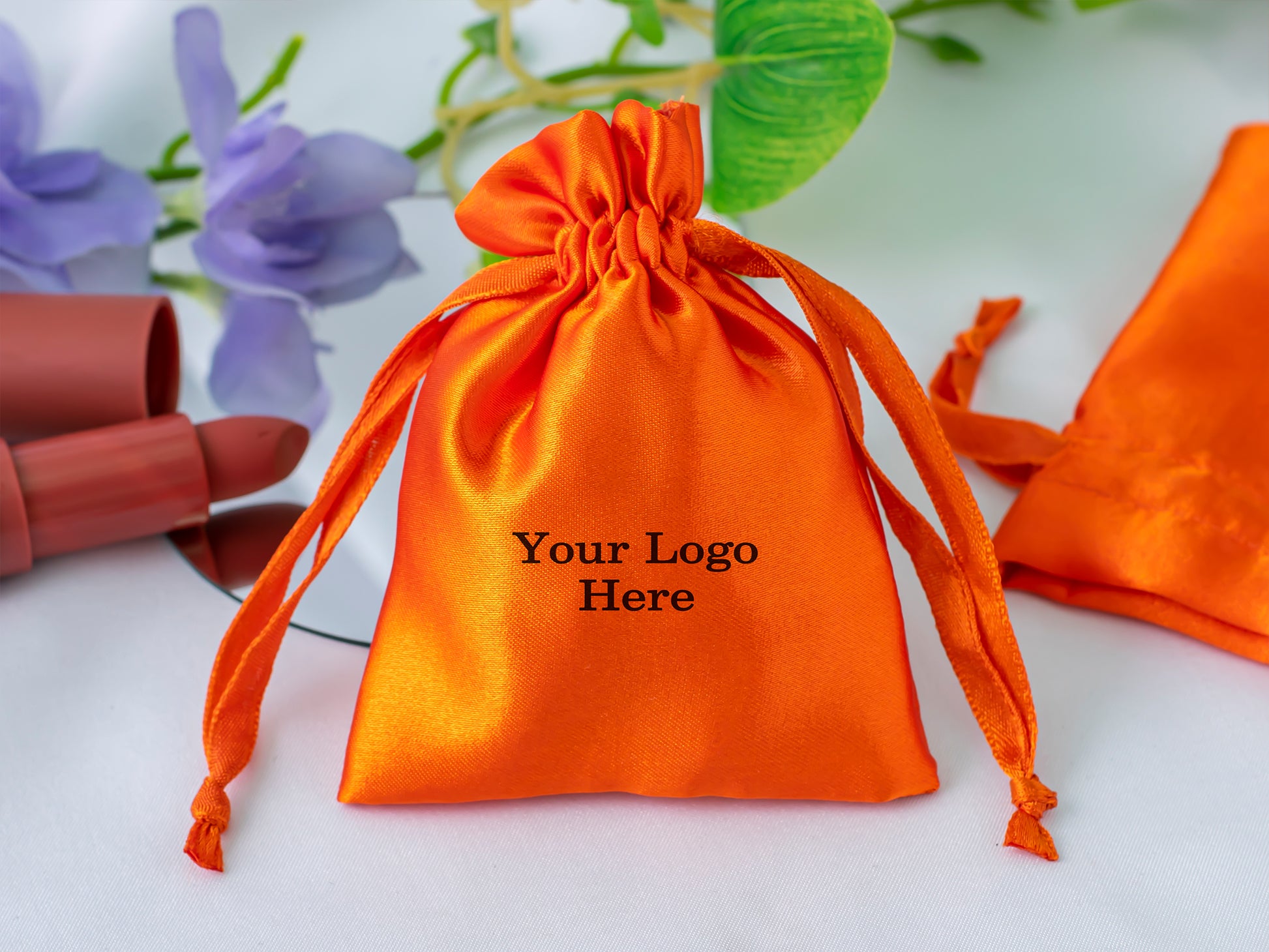 Pack of 100 - Orange Satin Drawstring Bags With Logo in Wholesale & Bulk